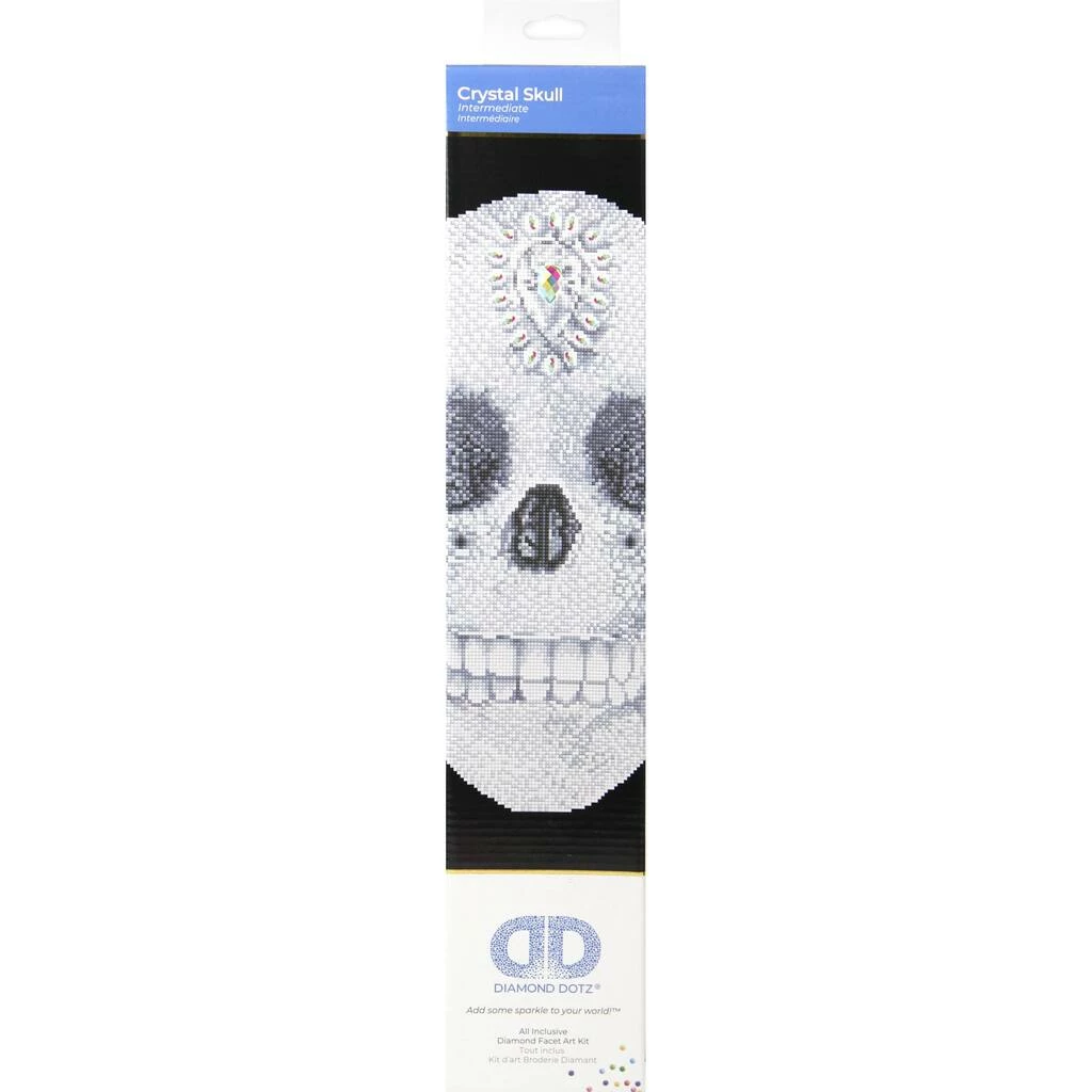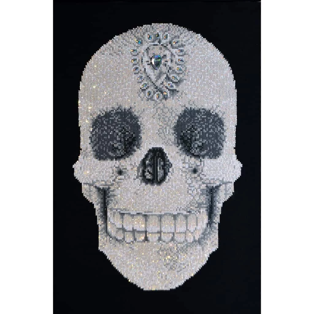 Diamond Dotz Facet Art allows you to paint with beautiful 13 faceted round diamonds onto high quality color printed fabric. Fashion a shimmering tapestry to decorate walls, adhere to a canvas bag, pillow, or more. The image features a skull with a paisley design in the middle of the forehead, on a black background.