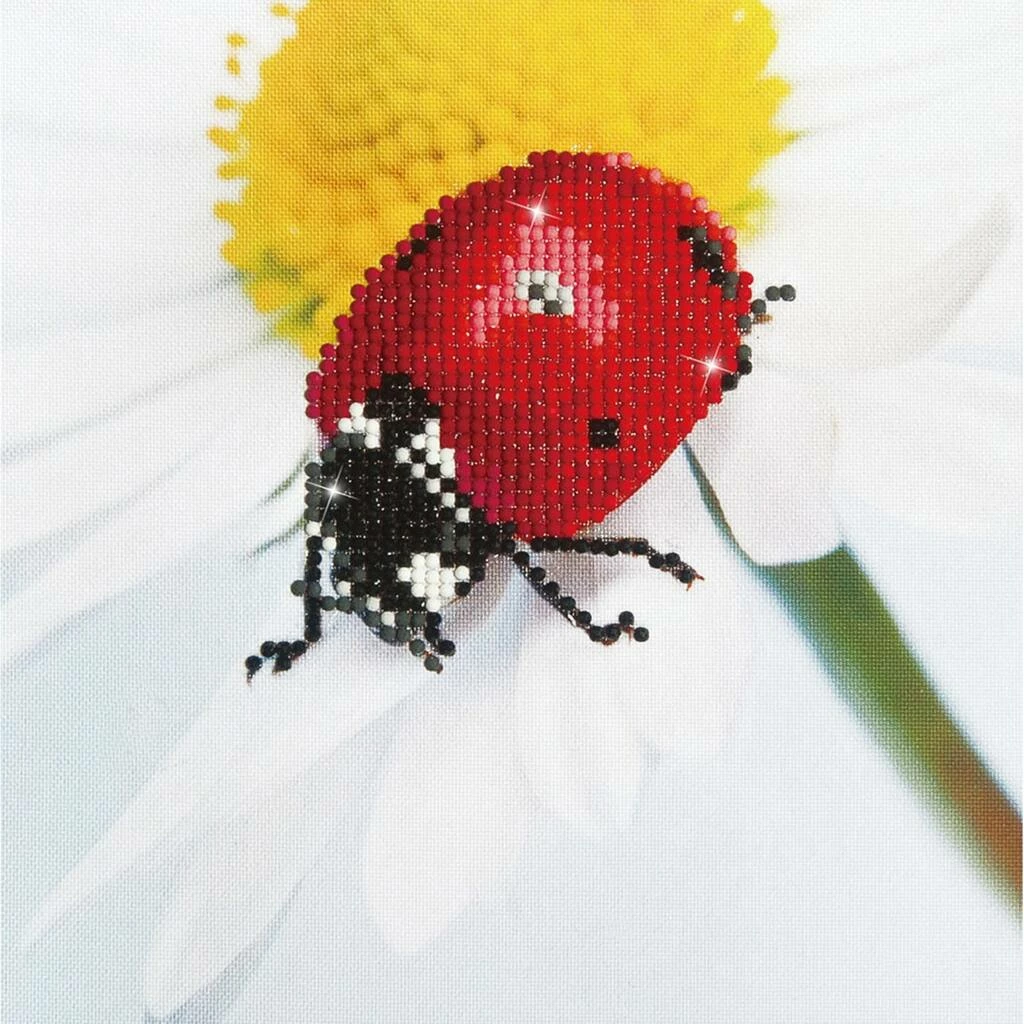 Diamond Dotz Facet Art allows you to paint with beautiful 13 faceted round diamonds onto high quality color printed fabric. Fashion a shimmering tapestry to decorate walls, adhere to a canvas bag, pillow, or more. This kit features a ladybug resting on a daisy flower.