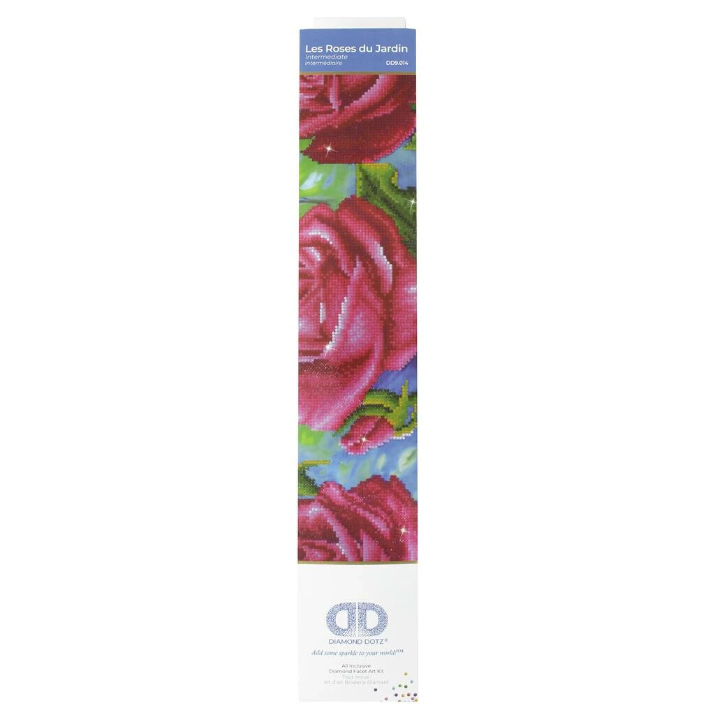Diamond Dotz Facet Art allows you to paint with beautiful 13 faceted round diamonds onto high quality color printed fabric. Fashion a shimmering tapestry to decorate walls, adhere to a canvas bag, pillow, or more. Image is of 3 beautiful pink roses with a blue and green gradient style background.